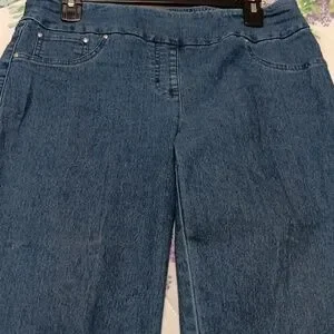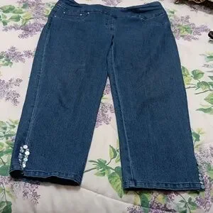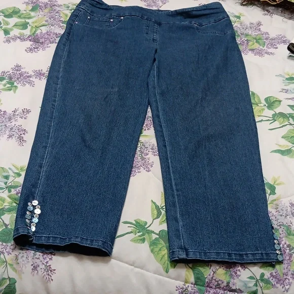 lightweight denim capris. Side slits decorated with blur sequins and silver grommets. Back pockets. Stretchy waistband. 32 inch length. Worn only a couple of times. smoke free and pet friendly home.