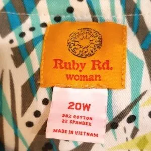 This Ruby Rd. jacket is a must-have for any fashion-forward woman. The colorful palm print and stone embellishments make it a standout piece in any wardrobe. The jacket is made of a comfortable blend of cotton and spandex, ensuring a stretchy and comfortable fit.
