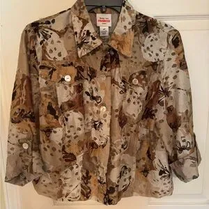 Earthy patterned jacket with button-up front. Features a mix of natural tones. Excellent condition