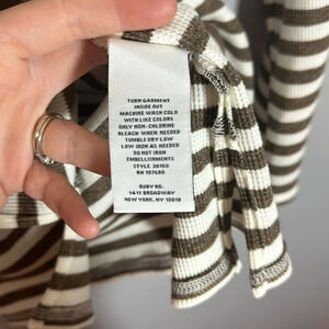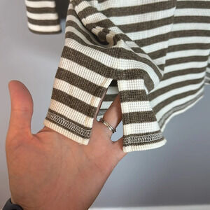 Ruby Rd Embellished Split Neck Striped Blouse Women’s Size Medium in a cream color with brown stripes and 3/4 sleeves. Perfect for fall!