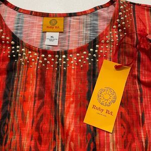 Beautiful Ruby Rd. women’s XL embellished tunic top featuring a vibrant red/black/gold abstract print and gold stud detailing around the neckline. Lightweight, stretchy, and perfect for holidays, work, travel, or everyday elevated style.