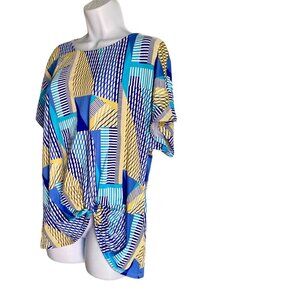 This Ruby Rd. Favorites top in women's XS is a colorful, textured short sleeve piece. Made of 95% polyester and 5% spandex, it has a stretchy feel and features a unique front twist. It's new without tags.