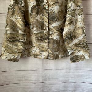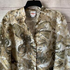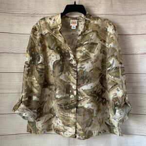 Taupe, beige, and cream floral and leaf button-up jacket by Ruby Rd. Favorites. The base color of this jacket is beige, taupe, or maybe a very subtle green family. It has a flower and leaf print all over it. The collared jacket has a burnout look with sheer spots. It has a full button-up front, long roll-tab sleeves, and small side slits at the bottom. It is pre-owned and in great condition.