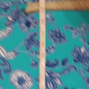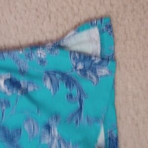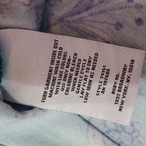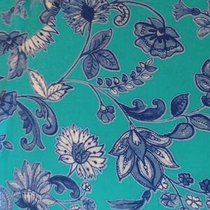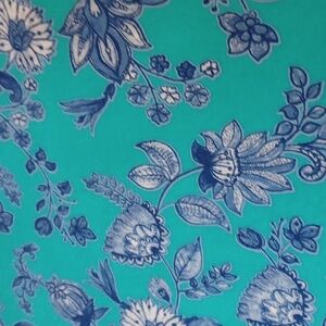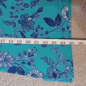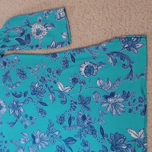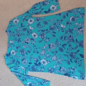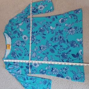 S Ruby Rd. floral tunic. 3/4 sleeves, rounded neckline, side slits. bright teal color with a darker blue floral pattern. 95% rayon, 5% spandex. material feels soft and smooth, with stretch. excellent pre-owned condition.
