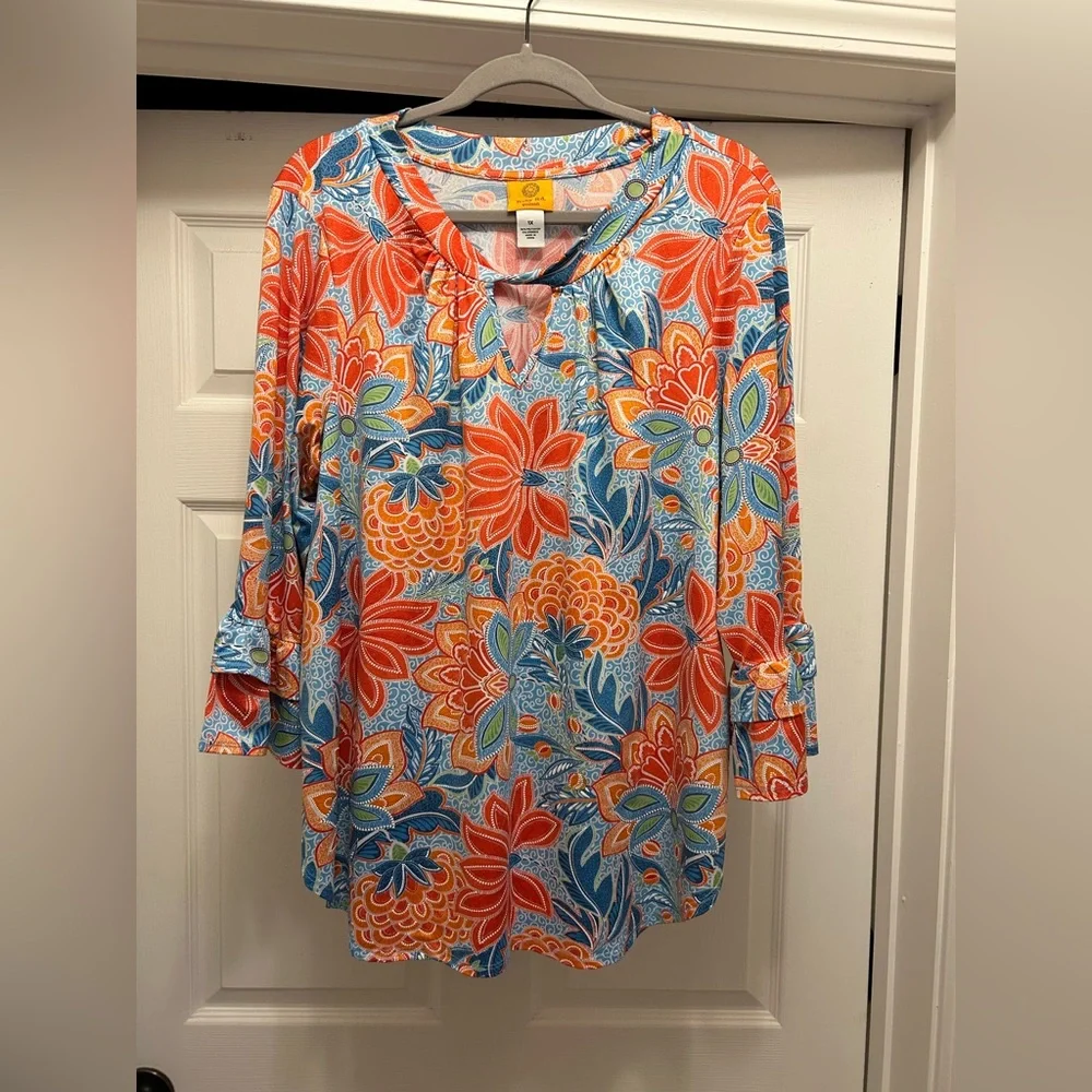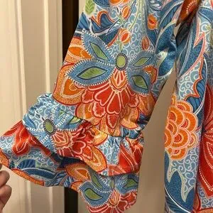 Bright floral design with a layered bell sleeve. Eye-catching orange and blue hues. Perfect for casual wear. Smoke free home!