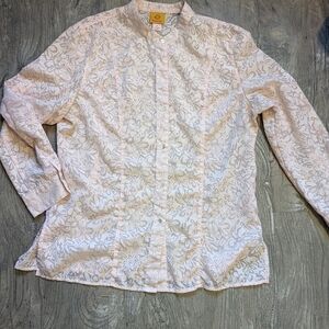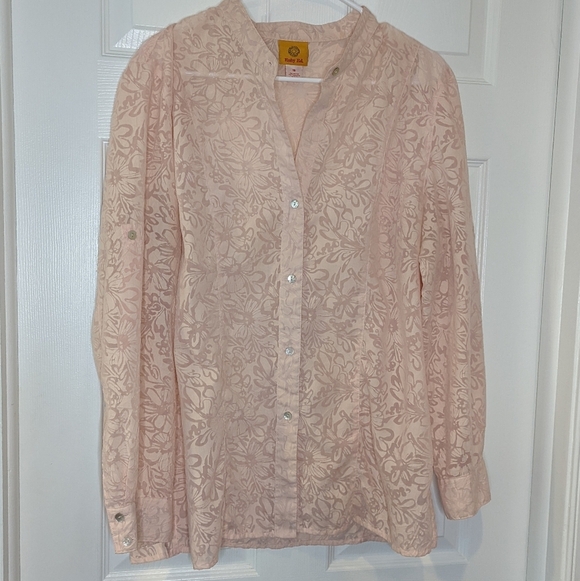 Up for sale is a Ruby Rd. plural print button up long sleeve blouse.Beautiful pale pink color.