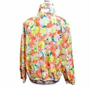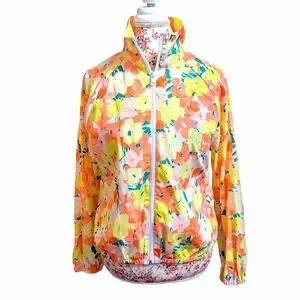 Brighten your wardrobe with this vibrant floral jacket. Lightweight, water-resistant material, perfect for spring! True to size. Excellent condition, no flaws.