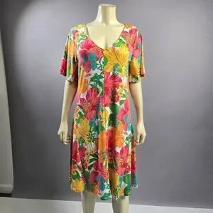 Vibrant floral dress by Ruby Rd. Features a mix of pink, yellow, green, and orange hues. Perfect for a colorful statement.