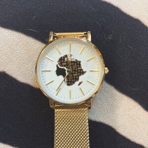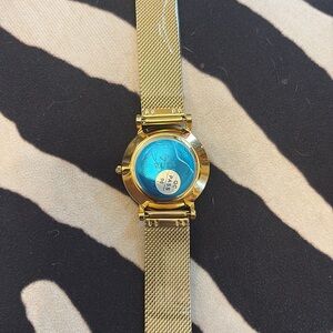 Elegant gold watch with mesh strap. Features unique dial design.
