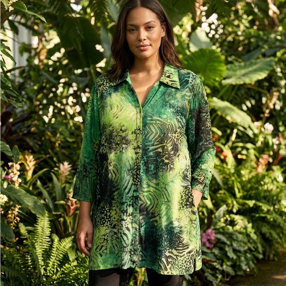 Vibrant green tunic with abstract patterns. Features a relaxed fit and three-quarter sleeves. Perfect for casual wear.