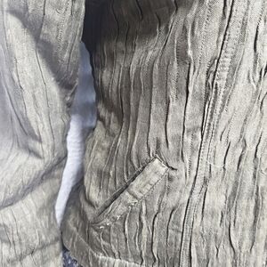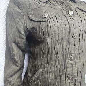 This Ruby Rd utility jacket in a striking green hue features a unique crinkled texture that adds a modern touch to its classic design. Crafted from lightweight, structured fabric, it offers a sophisticated sheen, making it perfect for versatile styling across various occasions.