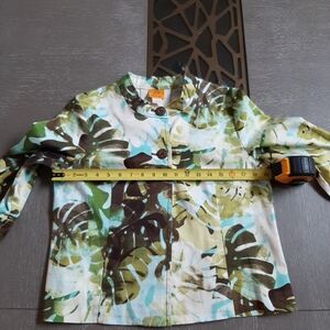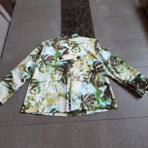 Stylish utility jacket with a vibrant leaf pattern. Features a button closure and lightweight fabric. Perfect for layering.