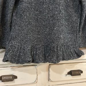 This Ruby Rd. grey cardigan has a scrunched and wave-like pattern on the collar and the back. This cardigan has the colors grey and white woven together, and would look great with either a black, grey, or white tank or dress shirt under. This sweater is also barely worn and has no visible damage.