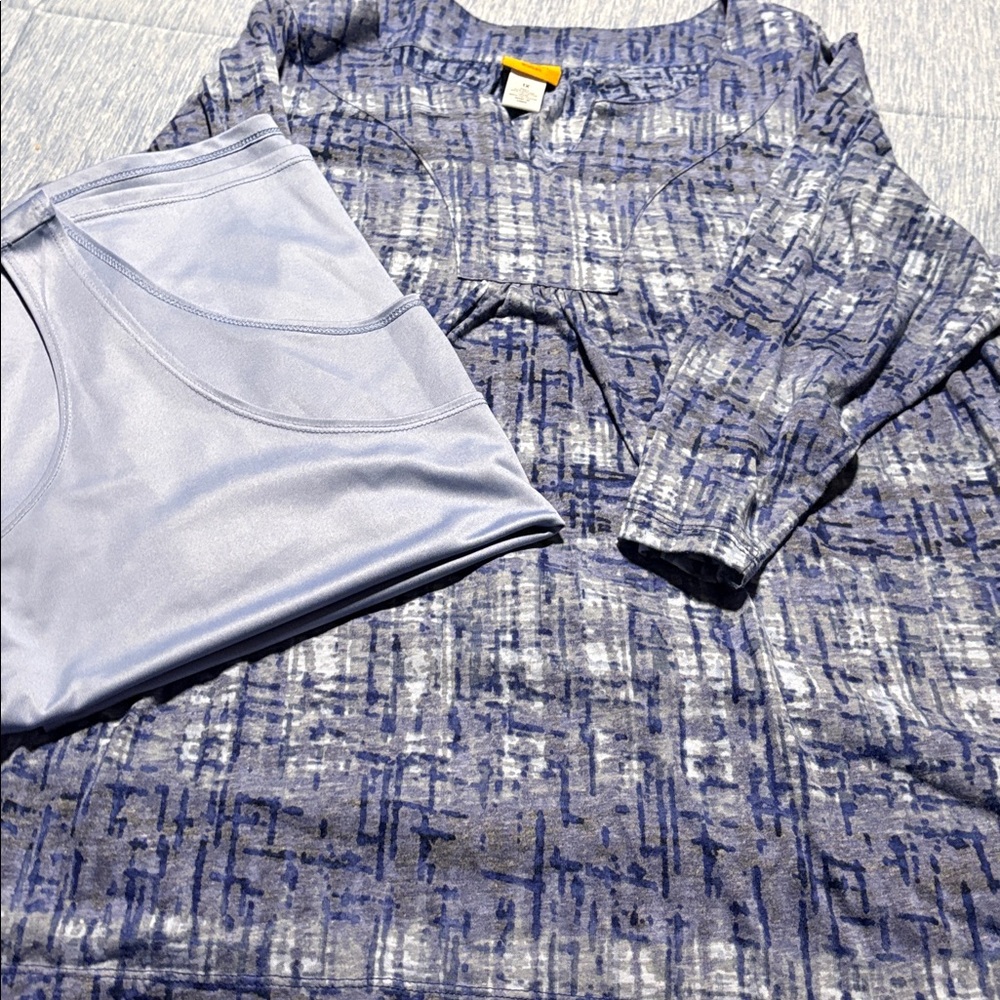Stylish indigo blouse by Ruby Rd. Features a unique pattern with a tank for under. Ideal for everyday wear.
