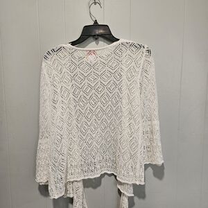 Delicate diamond pattern lace cardigan. Features bell sleeves and scalloped hem. Lightweight knit with elegant open stitch design. Perfect layering piece for any season.