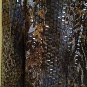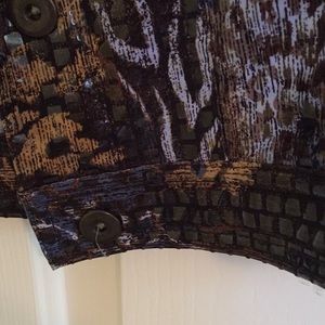 Beautiful brown, blue & tan long sleeve jacket with metal buttons and band along bottom.