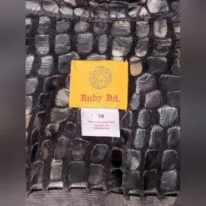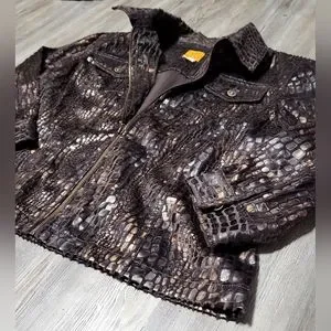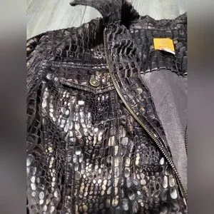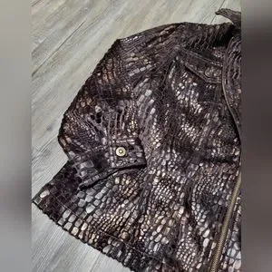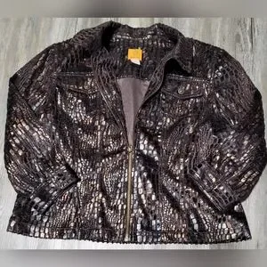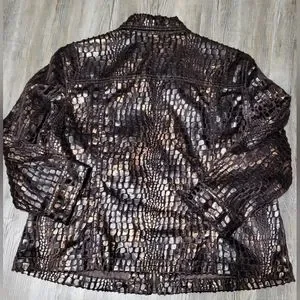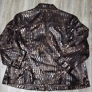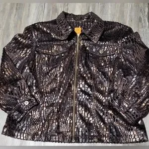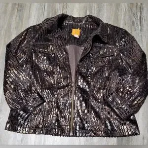 This is a size 18 jacket with a zip closure in the front with 2 breast pockets with button closures. This jacket has a snake skin look and feel. In EXCELLENT CONDITION.