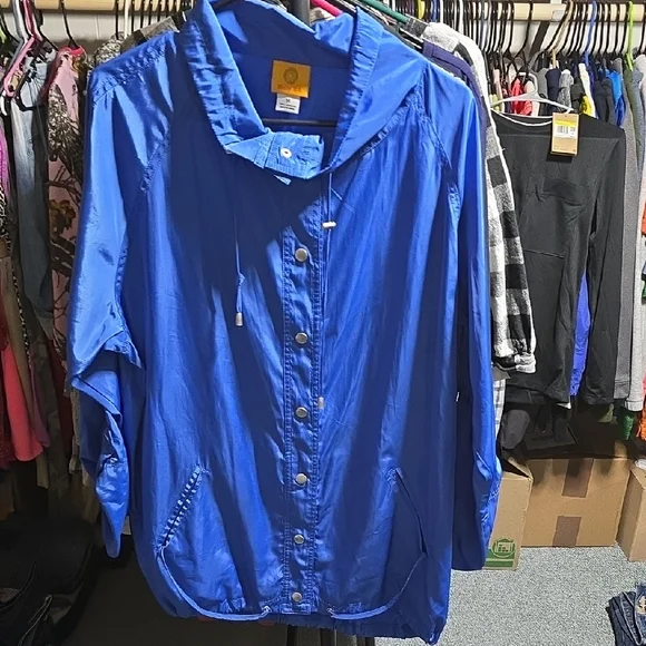 Vibrant blue jacket by Ruby Rd. Features a sleek design. Windbreaker style.