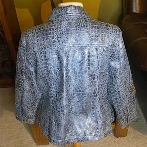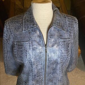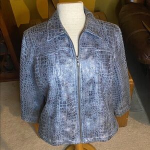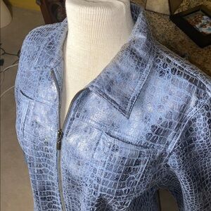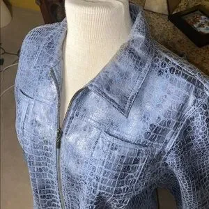 Stylish blue Crocodile pattern bomber jacket in a soft lightweight material with a faux leather feel. Full zip front and classic collar.