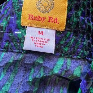 The Ruby Rd. Jacket is a stylish and versatile outerwear option for women in size 14. This 3/4 sleeve button-up jacket features a shiny black, purple, and green color combination, making it perfect for a variety of occasions such as travel, parties, or casual wear. Made of polyester, this basic jacket is designed to keep you warm during the winter, fall, and spring seasons. Upgrade your wardrobe with this trendy and eye-catching piece from Ruby Rd.