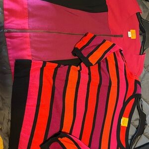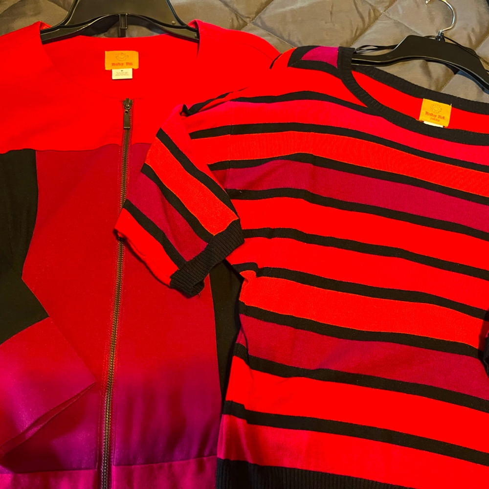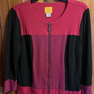 Ruby Rd- 3/4 Sleeves Jacket & Sweater. Jacket is size 8 & sweater is PL. I wear a size 8 & wore it with no issues. Lovely colors-red, fuschia, & black. Excellent condition.