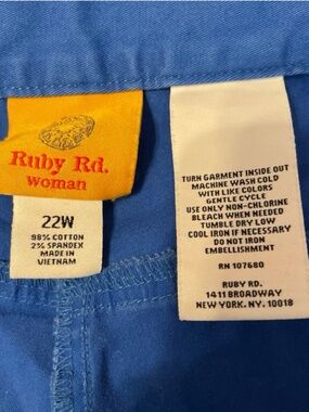 Brand: Ruby Rd. Size: 22W Material: 98% Cotton, 2% Spandex Waist side to side: 20.75 in Inseam: 23.5 in Leg opening side to side: 9.75 in