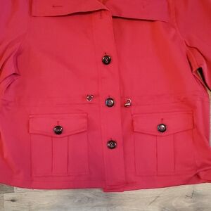 Chic red jacket for women! Features button details and front pockets. Ideal for cooler days.