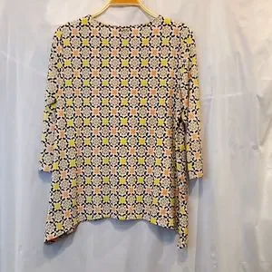 Excellent condition, clean, 3/4 sleeve, multi colors of tan, yellow, orange, black & white. Flowing swing type. Machine wash, says line dry but I turn inside out & machine dry 10 minutes then hang to finish drying = no wrinkles. Smoke free home. Size petite large.