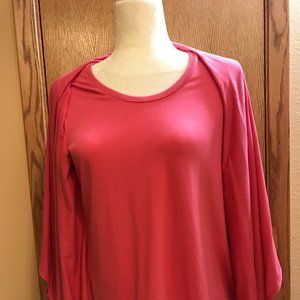 never worn, NWOT, PS, Ruby Rd pink, Layered look cardigan round neck shell, overall length of shell and cardigan measures, 22" long, but that doesn't include the length of the cardigan drape, the cardigan has 3/4" sleeve that measures 16" from shoulder seam, 62% Polyester/33% Rayon/ 5% spandex.