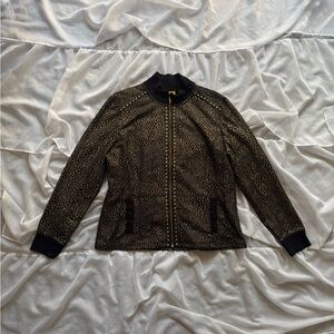 Rudy Rd. women's black and gold metallic leopard print long sleeve studded jacket. Chic bomber jacket, ideal for stylish layering and great for colder weather. Check the measurements for this second-hand garment to ensure it’s fitting.