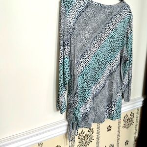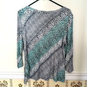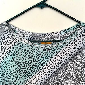 Ruby Rd Leopard Print Top PL Rhinestone Embellished Neckline Ruched Side Stretch