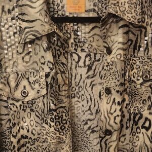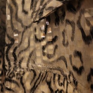 Black cream and white with leopard and zebra patterns. Features button-up front and classic collar. Subtle sparkles woven thru