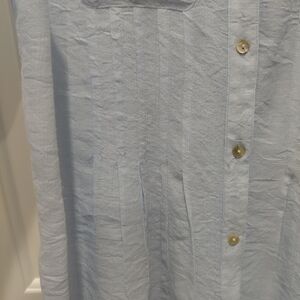 Soft light blue collarless tunic with a subtle texture. Classic button-front styling and neat seams. Easy to pair with many outfits.