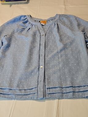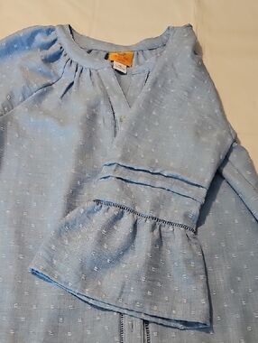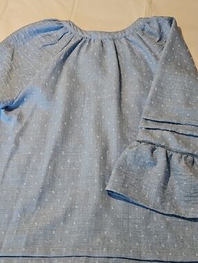 Light blue textured blouse by Ruby Rd. Button-front closure. Three-quarter bell sleeves with pintuck detail. Lightweight woven fabric with subtle dot texture. Casual and feminine style.