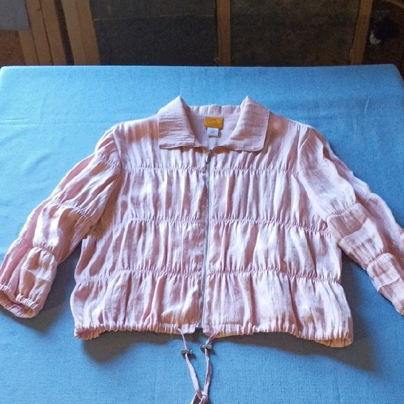 Light pink jacket with front zipper closure. Gathered hem with adjustable tie. Lightweight woven fabric for easy layering. Simple, feminine silhouette.