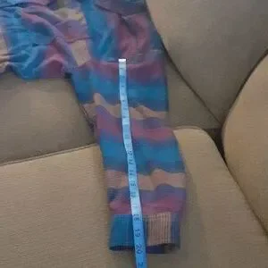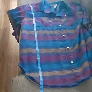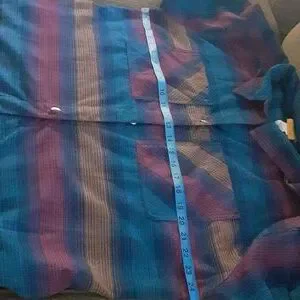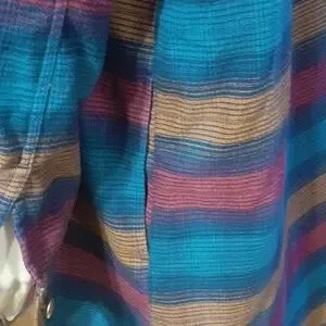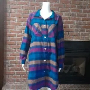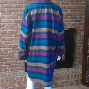 Vibrant button-down lightweight longsleeve jacket with blue and purple stripes with side pockets.