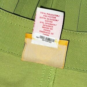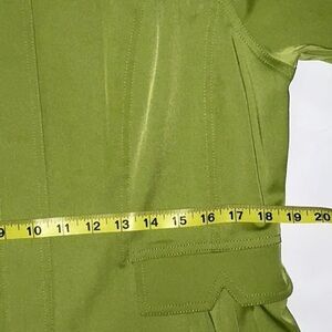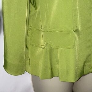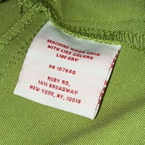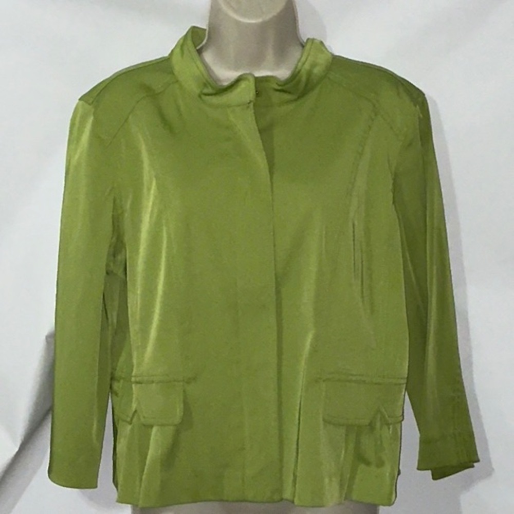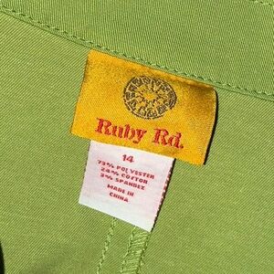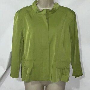 This is a cute, lightweight jacket from Ruby Rd. Size 14. Color is green. Jacket zips up the front. Has cute ruffles in the back. Fabric has a very slight stretch to it. There is a tiny bit of discoloration on the bottom of the left sleeve - see picture 13.