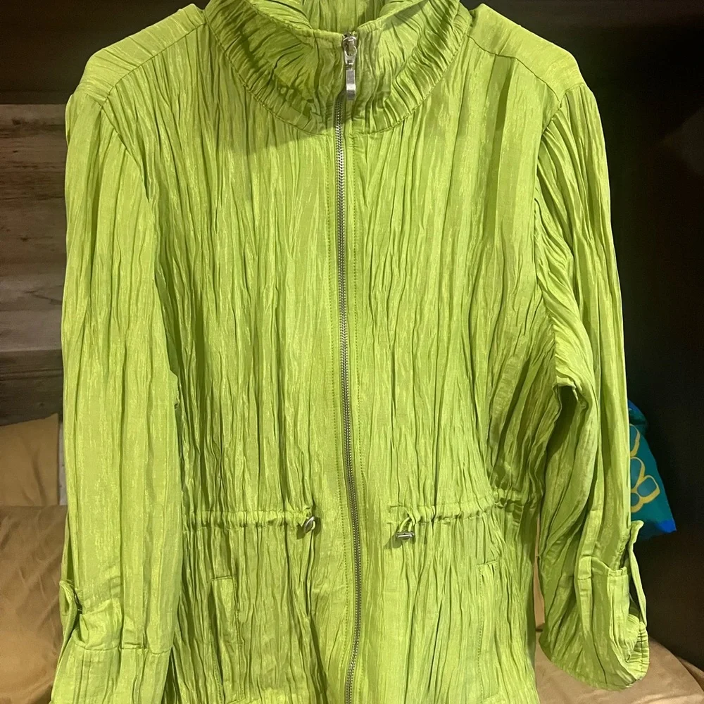 Vibrant lime utility jacket with zip front. Lightweight and stylish. Perfect for layering.