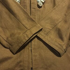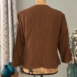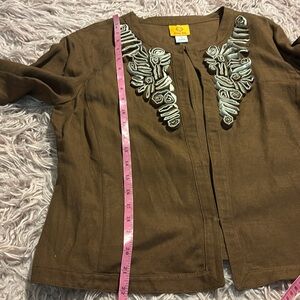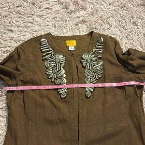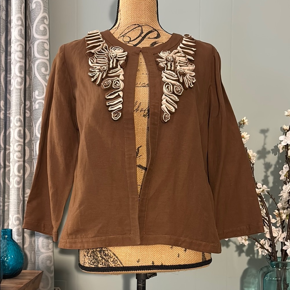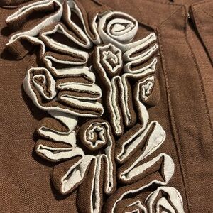 Ruby Rd. Linen Blend Boho Embroidered Shirt. Brown with raised brown and cream embroidered neck. Two hook and eye closures at front. Linen Blend. Can be worn as open shirt or light jacket. Excellent condition. Size 10.
