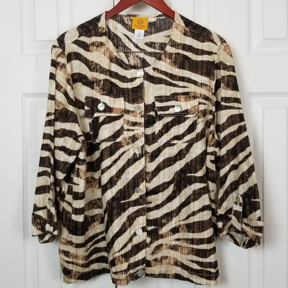 Linen Tiger print. Length 25" Sleeve 19" Shoulder width 18" EUC G