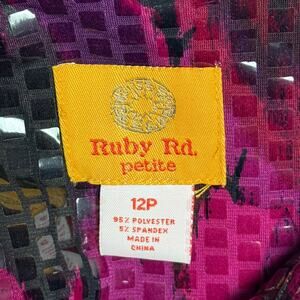 Vibrant patterned jacket by Ruby Rd. Front zip closure and classic collar. Long sleeves with button cuffs. Lightweight structured silhouette. Bold magenta and black abstract print.