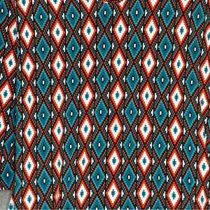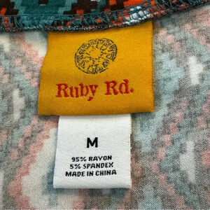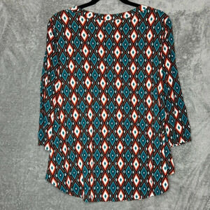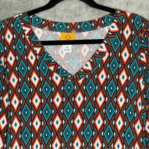 Ruby Rd Medium Shirt Top Teal Blue Orange Geometric 3/4 Sleeve V Neck Stretch