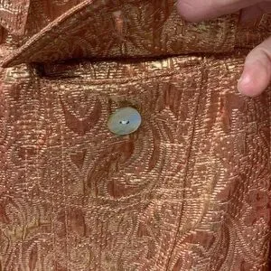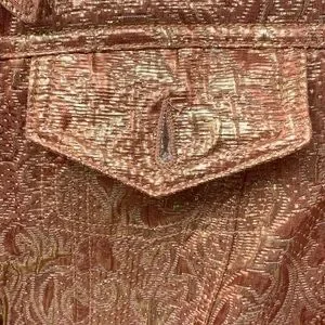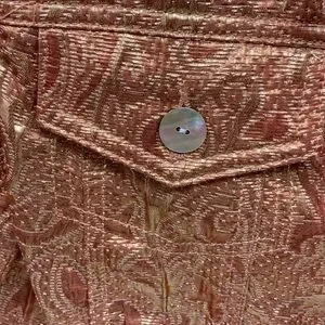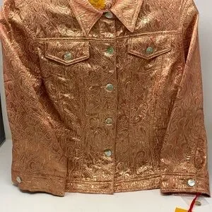 Shimmering metallic gold jacket. Features paisley pattern. Button-up front with pockets.