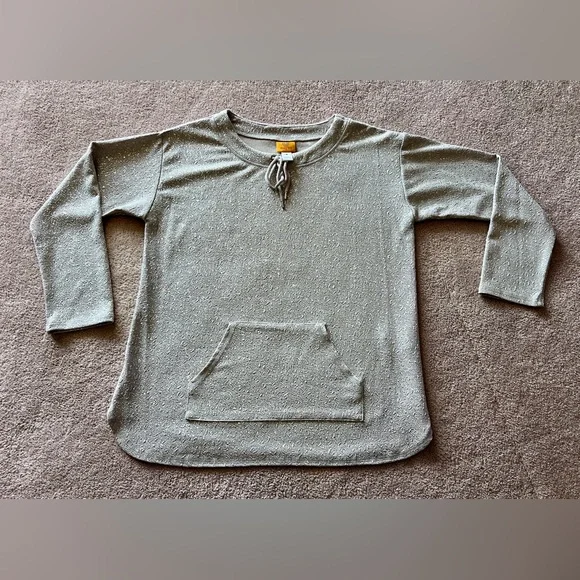 Casual and comfy gray top with textured pattern. Features a stylish drawstring detail and front design pocket. Great to pair with leggings and cute sneakers. Fun sparkly.
