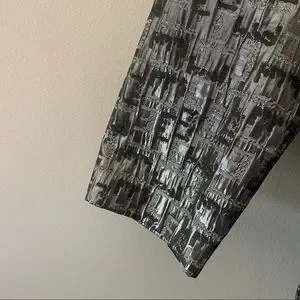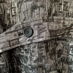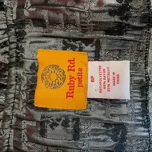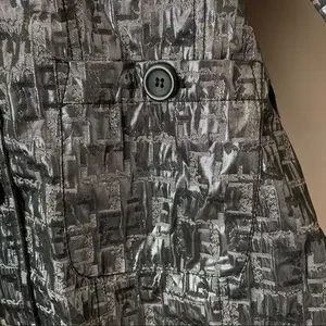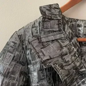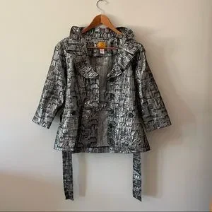 This unique jacket certainly stands out! Black and silver with shiny material to really give it the metallic look. The color is super fun with all the frills and ruffles. Front buttons and a belt/sash which can be removed. Super fun for fancy occasions, church, etc. and truly makes a statement!