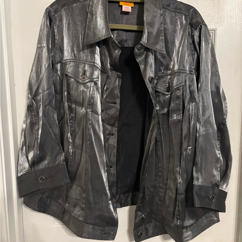 Stylish metallic silver jacket with button-up front. Features long sleeves and a classic collar.