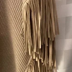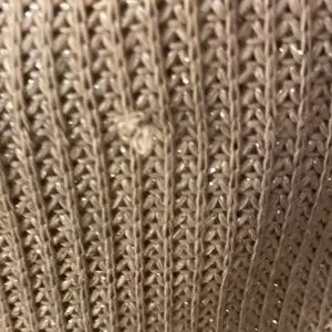 Small snag on inside of sweater but not seen on the right side. Beautiful fringes. The sweater has seams and measures 18 inches from seam to seam. Sparkly and pretty. Last picture is the sweater inside out to show seams.