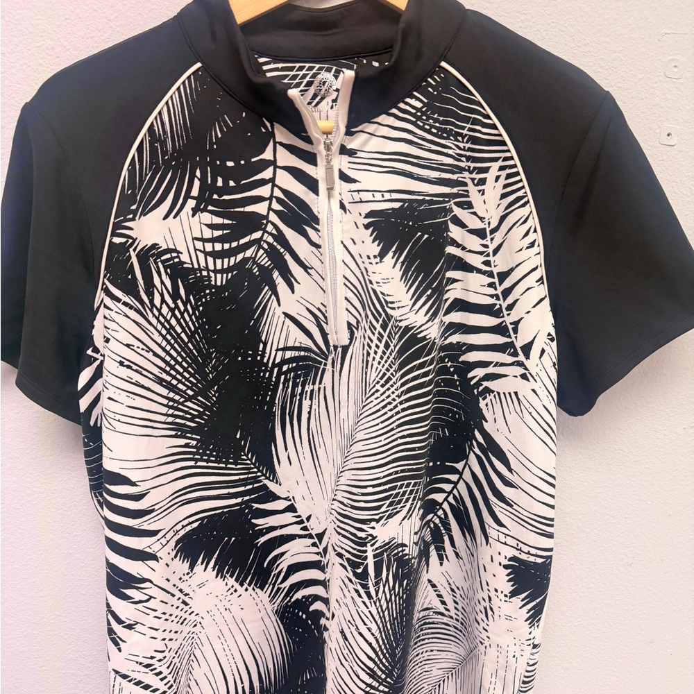 Chic top with a monochrome leaf design. Features a zip-up front and short sleeves.