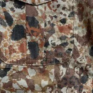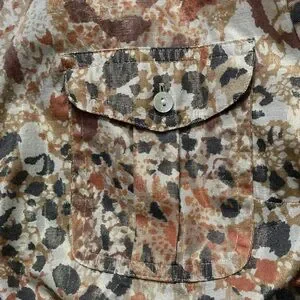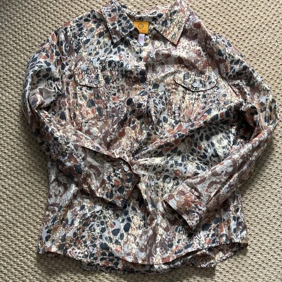 Stylish blouse with abstract pattern and metallic threading. Button-up front. Long sleeves. Perfect for casual wear.