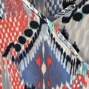 Stylish blouse with abstract patterns. Features blue, red, and black accents. Perfect for any occasion.